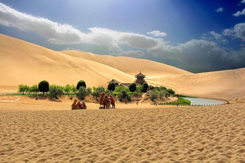 - Suối Nguyệt Nha- Minh Cát Sơn là một trong 5 khu sa mạc đẹp nổi tiếng của Trung Quốc, Minh Cát Sơn xếp thứ 4, bãi sa mạc đã có từ hai nghìn năm mà suối Nguyệt Nha nằm trong khu vực sa mạc không bị khô cạn, dài 218 m từ Đông tới Tây và rộng 54m từ Bắc tới Nam, chứa trong lòng nó là làn nước trong xanh như nước mùa xuân ngay giữa vùng sa mạc. Kế bên hồ là một ngôi chùa cổ, một hàng cây xanh rủ bóng mát cùng các cửa hàng lưu niệm. Du khách tới đây không chỉ vì hiếu kì sự tồn tại của một ốc đảo xanh tươi giữa sa mạc mà còn được cưỡi trên lưng lạc đà giữa sa mạc mênh mông để chiêm nghiệm lại cảm giác của người xưa khi di chuyển trên “ Con đường Tơ Lụa” (TẶNG PHÍ CƯỠI LẠC ĐÀ)