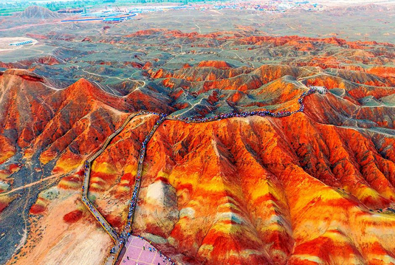 - Công viên địa chất Trương Dịch Đan Hà – hay còn gọi là Địa Mạo Đan Hà là một khu vực cực kì rộng lớn, trải dài từ miền Đông Nam đến Tây Bắc của Trung Quốc với nhiều cảnh đẹp hùng vĩ như tranh vẽ. Trong đó nổi tiếng nhất là dãy núi Đan Hà “ 7 sắc cầu vồng”. Đến đây bạn sẽ không khỏi thán phục vẻ đẹp tuyệt mỹ của vùng đất sa thạch đỏ rộng lớn kéo dài từ Đông Nam đến Tây Bắc Trung Quốc. Bên cạnh những khối sa thạch đỏ hình gợn sóng độc đáo, du khách có thể trải nghiệm cuộc đi bộ đường dài đầy thú vị để chiêm ngưỡng cảnh đẹp ở các thung lũng, các dãy núi đá hùng vĩ. Tất cả tạo nên một Địa Mạo Đan Hà sống động và tươi đẹp. Địa Mạo Đan Hà quả là một tiên cảnh trần gian khiến ai cũng phải ngỡ ngàng trước vẻ đẹp hoang sơ, kì vĩ của thiên nhiên.