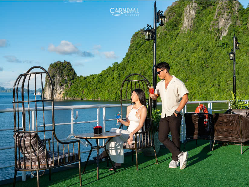 15:45: Du khách trở lại tàu để tham gia Sunset party, tận hưởng những giây phút thư giãn thoải mái, ngắm hoàng hôn buông xuống thật dịu dàng và yên bình. Du khách thưởng thức đồ uống cùng snack, bánh ngọt và trái cây tươi trên sundeck.